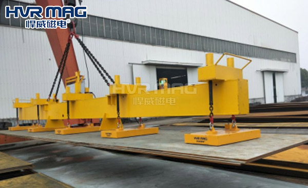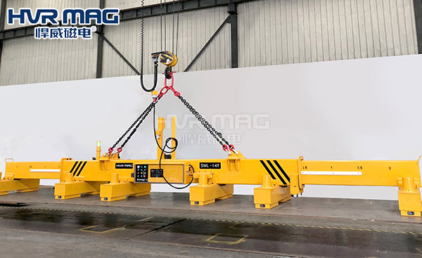 在面對鋼材多種工況時候電永磁吊具的其他功能就能發揮出最大的效果,比如在裝車時需要一次性吊裝多張,電永磁起重器就能實現,磁力可分檔調節,實現多張同時上料,單張下料的強大功能,或者是成排的方坯都可以一次性進行吊裝。
