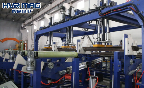 電永磁可以通過(guò)機(jī)器人或者桁架、智能行車等智能設(shè)備結(jié)合在一起。通過(guò)PLC運(yùn)行程序,完美的進(jìn)行搬運(yùn)各種各樣的工件,并且可以通過(guò)PLC設(shè)置的信號(hào)值,搬運(yùn)不同大小和厚度的工件,實(shí)現(xiàn)針對(duì)不同工件使用不同透磁深度和不同磁鐵分組的控制。采用電永磁鐵可以加速提升整個(gè)生產(chǎn)車間的生產(chǎn)速度。