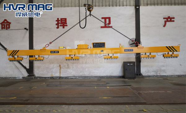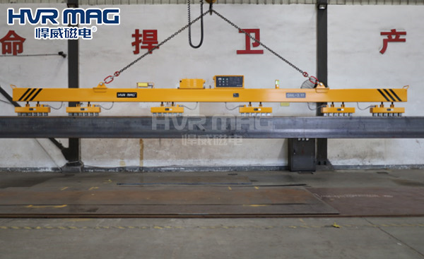 相比于單一的充電式電永磁吊具而言,將多臺電永磁鐵均勻分布在橫梁兩側,進行聯吊的充電式電永磁吊具其吊裝能力起重能力更強,更適合吊運重達數十噸的鋼材,操作人員可通過遙控器或電永磁吊具上的控制面板控制吊具的裝卸。
