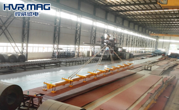 對于鋼板的吊裝,方法有多種多樣,但是22米的長鋼板吊裝就比較復雜了,一般的鋼板吊具進行吊裝的時候容易造成鋼板變形,河南某集團就因為長鋼板吊裝難的問題而尋求悍威磁電的幫助,希望悍威磁電的工程師可以根據他們的工況來進行方案定制,為他們解決長鋼板吊裝難的問題。