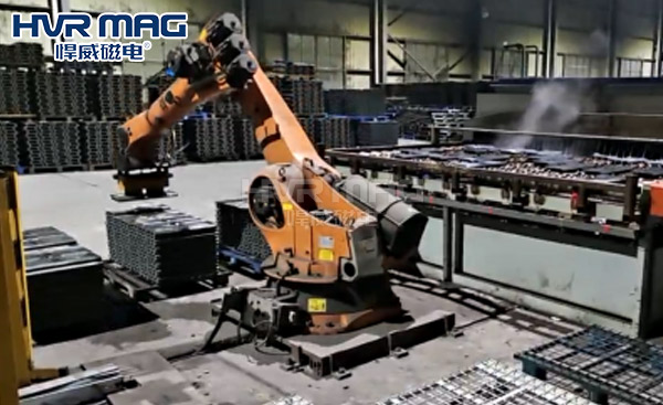 為了徹底解決這一問題,客戶決定將整條生產線改造為自動化焊接生產線,通過網絡渠道找到了悍威磁電,經過詳細的溝通,悍威磁電的工程師針對客戶的需求提出了定制的解決方案。從焊接過程中的上料、下料到工件的焊接和固定,整個過程都是利用自動化電永磁鐵來完成。