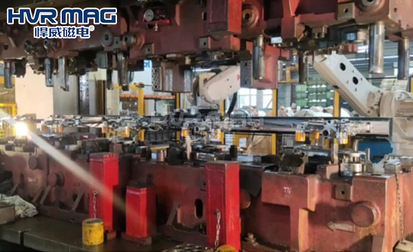 在全自動PLC鍛壓生產線上,用于EOAT(機械臂末端工具)的15個端拾器磁力夾具有助于輕松裝卸金屬鍛壓工件。悍威磁電機械手端拾器磁力夾具助力鍛壓生產線智能制造,實現精益化生產,打造全自動智能車間。