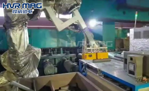 悍威電永磁鐵配合智能機器人搬運高溫圓棒