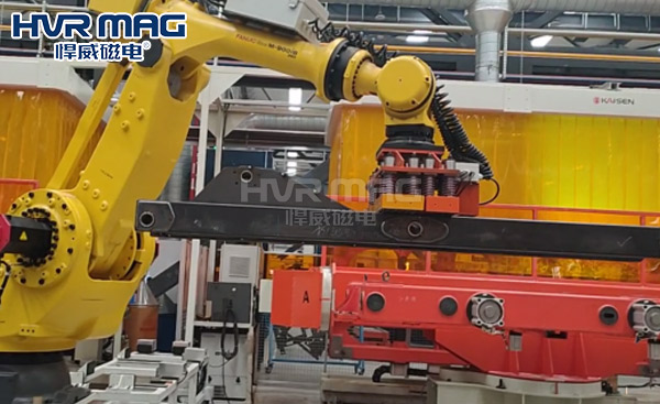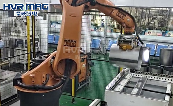 在自動化生產車間,工業機器人吸盤抓手是自動化搬運、碼垛的主要末端抓取設備,它決定著工業機器人能否將工件順利搬運至指定位置,且不對工件表面進行刮傷。機器人吸盤抓手的種類有很多種,如:氣動夾具、真空吸盤以及磁力吸盤等,今天悍威磁電小編給大家介紹的是由電永磁鐵構成的機器人電永磁吸盤。
