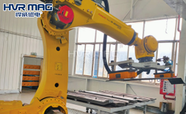 悍威磁電研發生產的機器人磁力抓手可按需定制,非標準品,兼具靈活性和實用性,擁有體積小,靈活性強,可全程PLC控制,效率高等優勢,適用于各種金屬導磁性工件的搬運以及碼垛,如鋼板、鑄鐵、鋼管、各種加工后的零部件等等。