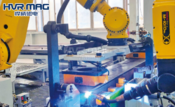 悍威磁電機器人磁力抓手不僅可以滿足各種工件的抓取還可以充當磁力固定工裝,滿足自動化生產的另一大應用,使用電永磁鐵將工件牢牢固定,再讓焊接機器人自動化焊接,這樣既能保證定位的精確性,還可以提高焊接效率,讓整個工序全自動化,可隨時響應未來不斷變化的生產需求。