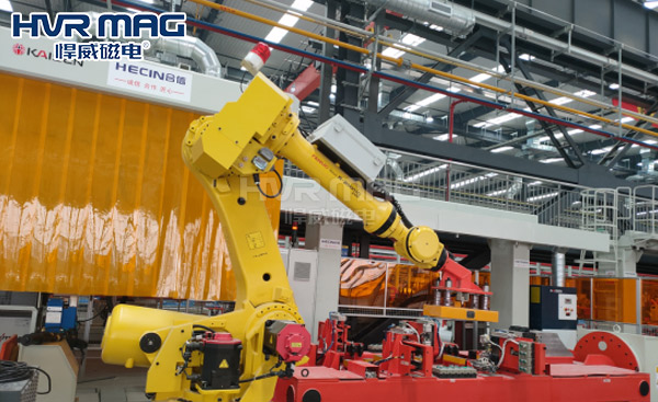 通過詳細(xì)的溝通和討論,悍威磁電工程師最終選定單臺HEPMP-5018P50S電永磁鐵用到機(jī)器人上,該款電永磁鐵可以兼容滿足客戶的工件搬運(yùn)需求,搭配機(jī)器人通過PLC控制,實(shí)現(xiàn)無人化操作,3倍安全系數(shù)來保證工件吸附力,電永磁鐵斷電不失磁的特性也讓企業(yè)在加工生產(chǎn)過程中不會因?yàn)榫€路故障或者停電造成工件掉落的安全隱患,整個(gè)方案高效、便捷、節(jié)省人工、安全、環(huán)保,非常符合客戶的長期經(jīng)營理念和要求。