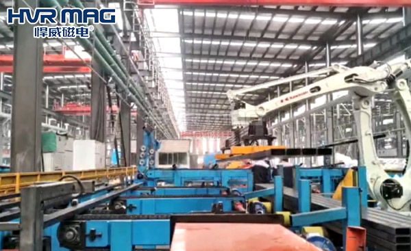 目前,多臺悍威電永磁夾具正在客戶車間有條不紊地搬運成排方管,前段時間,悍威磁電有關工程師進行客戶回訪時,客戶表示對悍威電永磁夾具配合工業機器人上下料這塊的應用非常滿意,并表示電永磁鐵搬運方管的實用性非常強,完全能應對車間高強度的工況。