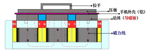 一般起吊溫度在200℃以下的黑色金屬制品,溫度達500℃時電永磁吸盤的起吊能力就會下降50%左右。當溫度達到700℃時,則沒有起吊能力(一般碳素鋼到785℃磁性全部消失)。電永磁充磁狀態:磁力線通過壓板形成磁回路(夾持工件)圖片