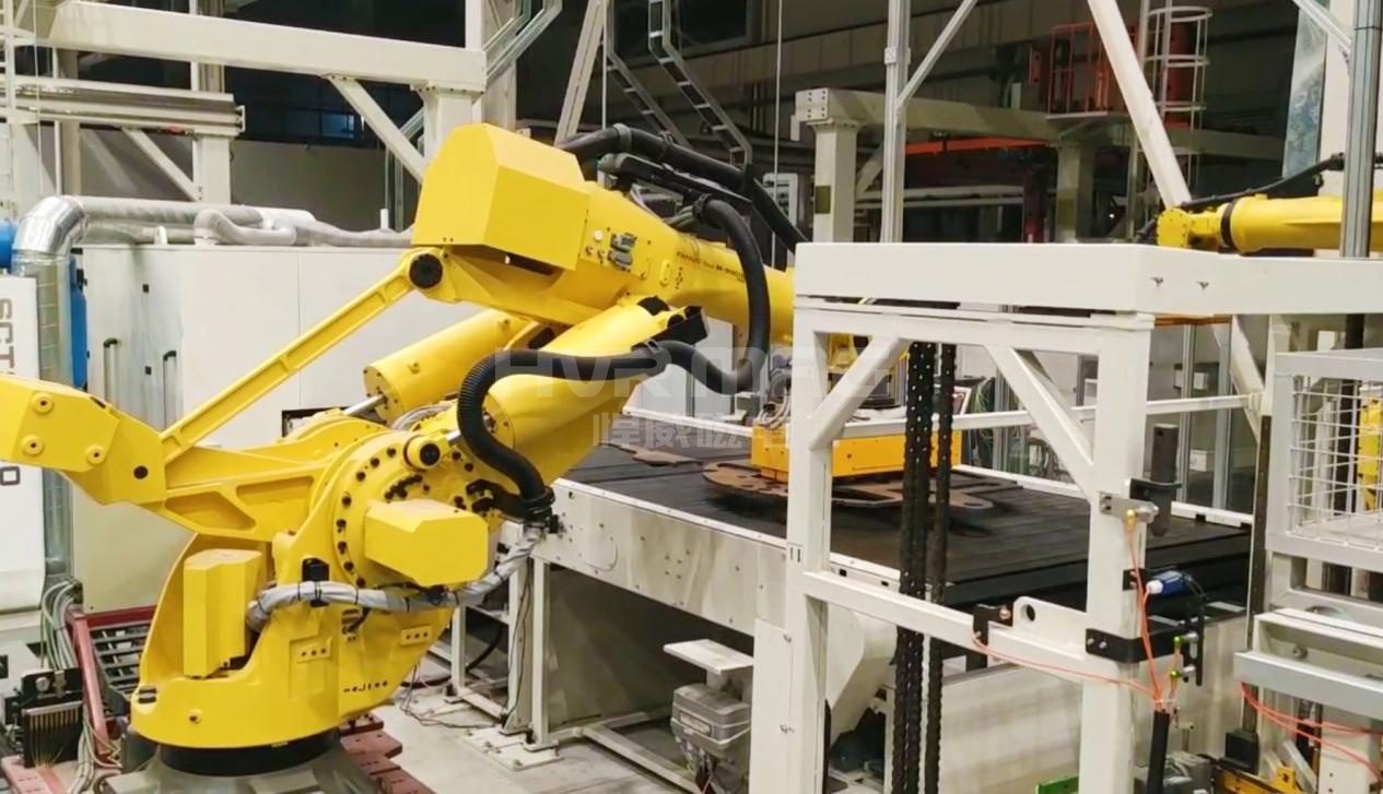 第一種是符合數字化工廠的無人操作模式,即利用機器人、端拾器等設備進行自動化分揀搬運。首先在桁架機器人和自動化機器人手臂末端安裝上悍威磁電所生產的端拾器,即可將形狀各異的不同導磁零件運送至傳送帶上,經傳送帶傳送至指定地點,然后自動化機器人端拾器抓取零件,并放置在指定位置,即可完成切割后零件的自動化分揀碼垛。