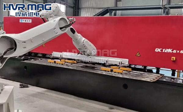 電永磁鐵作為工業生產中吸附工件的一大利器,除了可以作為電永磁起重器搬運鋼板、鋼管等工件之外,還可以將其安裝在工業機械手末端用來實現自動化搬運。今天電永磁吸盤廠家悍威磁電帶您走進車間,看下悍威機械手磁力吸盤吸附工件進行翻轉的車間實景案例。