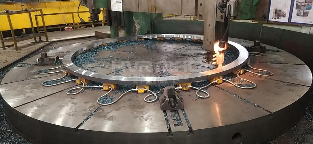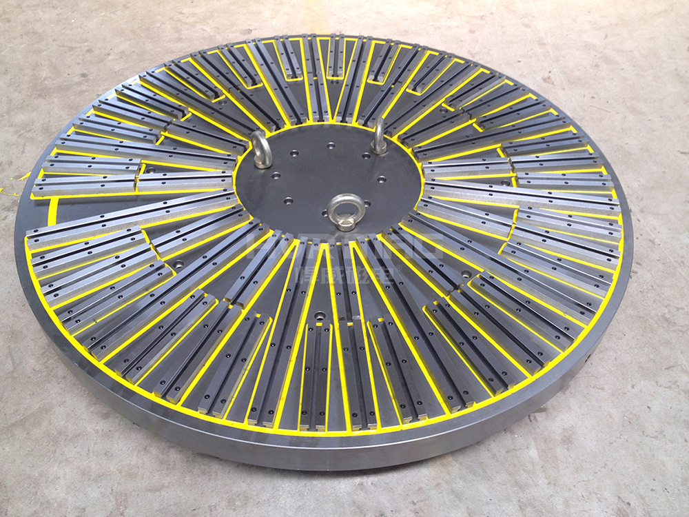 由于電永磁吸盤的磁吸力均勻穩定,可以通過控制器控制充退磁,還可以和數控機床PLC系統連接,非常適用于大型自動化車間生產線。下圖的數控立車加工臺面,就用到了悍威磁電的電永磁吸盤來對加工的風機墊片進行固定。