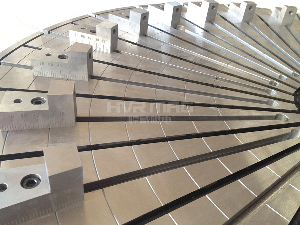 針對這種特殊的圓形工件,悍威磁電提供的設計方案是用多臺雙面電永磁吸盤組合使用替代原有夾具,每臺吸盤上下兩面均有磁力,可以自由組合擺放,用于不同工件的加工,相對傳統的電永磁吸盤,大大節約了企業的采購成本。