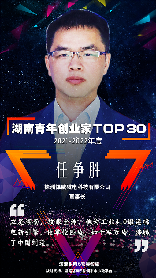 據(jù)悉,本次「湖南青年創(chuàng)業(yè)家」評選面向45歲及以下湖南籍或最近一年在湖南工作的創(chuàng)業(yè)者中開展。自今年3月組委會發(fā)起征集令以來,共收到100多份自薦或推薦申請表,專家組綜合候選人的影響力、創(chuàng)新力、社會責(zé)任、投資價值等六大指標(biāo)進(jìn)行評定,最終推選出了2021-2022年度湖南青年創(chuàng)業(yè)家TOP30名單,悍威磁電董事長任爭勝先生便列于名單之上。
