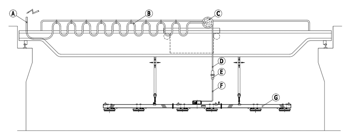 A:輸入電源 B:行車滑線 C:電纜卷筒 D:卷筒升降電纜 E:重載連接器 F:電永磁控制系統電源進線 G:橫梁