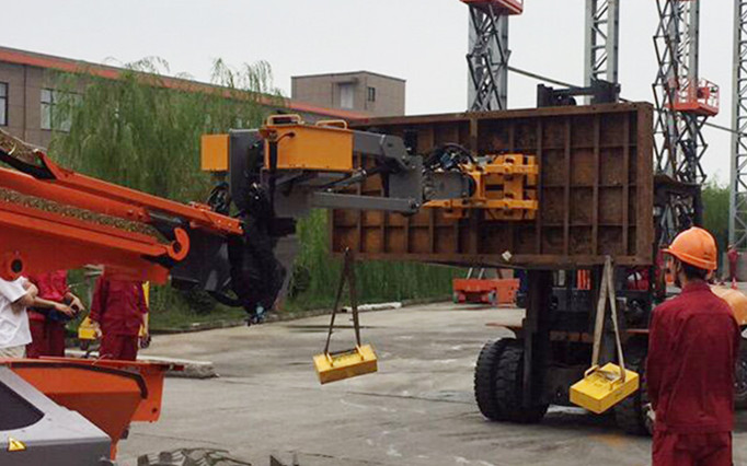 由悍威磁電專門設計生產的充電式磁力吊具,安裝在高空作業平臺車的末端,形成了一種獨特的可靈活移動的磁力搬運設備:可以從叉車上抓取模板,與平臺車一起將其搬運到室內車間,最后將其放置到指定的位置。