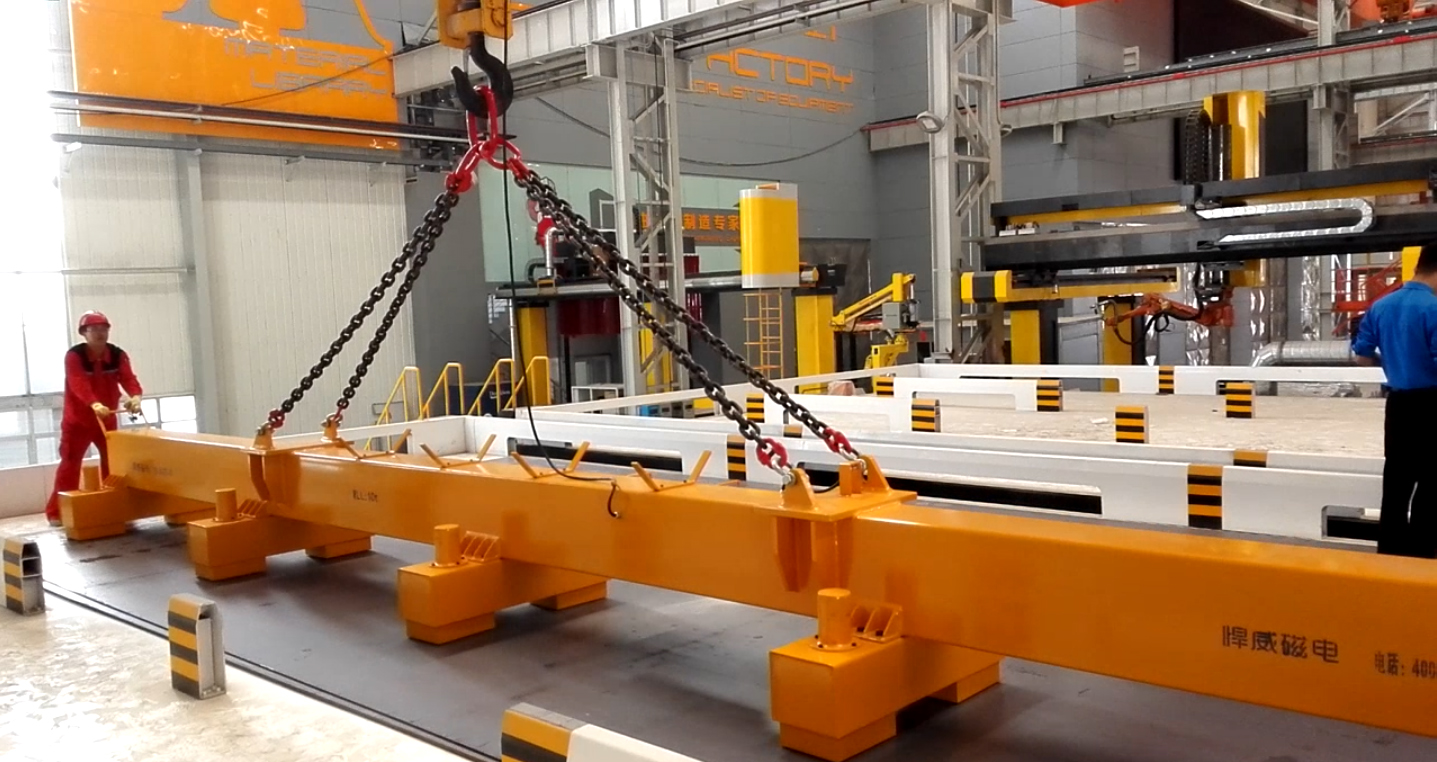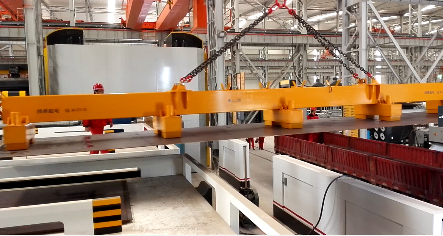 解決方案:設(shè)計用10臺HEPMP-1000P50按2行5列布置聯(lián)合吊運,吊具磁鐵可分組控制,適應(yīng)不同長度鋼板吊運,磁力可調(diào),滿足了客戶不同板厚鋼板一次吊運一張,不粘連第二張的要求,且無需人工分板,全程無線遙控器操作,只需一名工人且勞動強度低,充退磁時間<2S,不但降低了工人數(shù)量和勞動強度還提升了吊運效率,且鋼板表面無劃痕產(chǎn)生,吊運時不要電,吸力永久保持,具有極高的安全性。