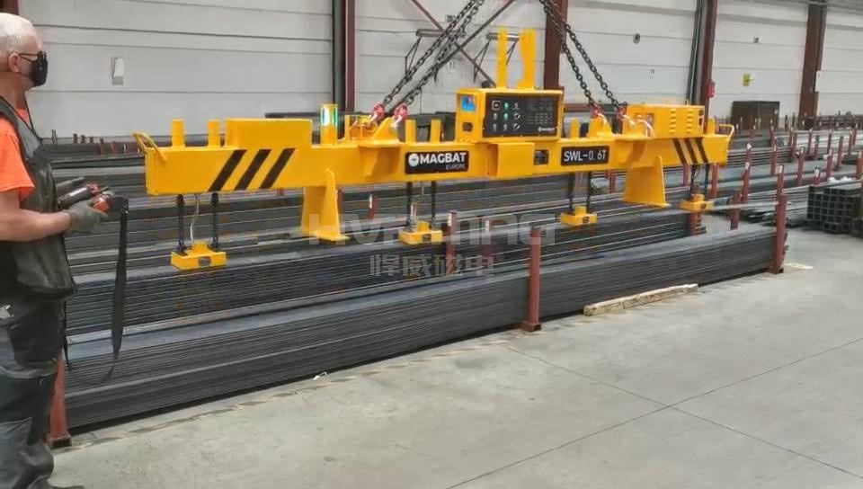 圖中所示是國(guó)外某客戶的車間,使用悍威磁電生產(chǎn)的600kg充電式磁力吊具,吊運(yùn)又薄又窄的鋼板。客戶要求一次吊起一張,且不粘連第二張板。