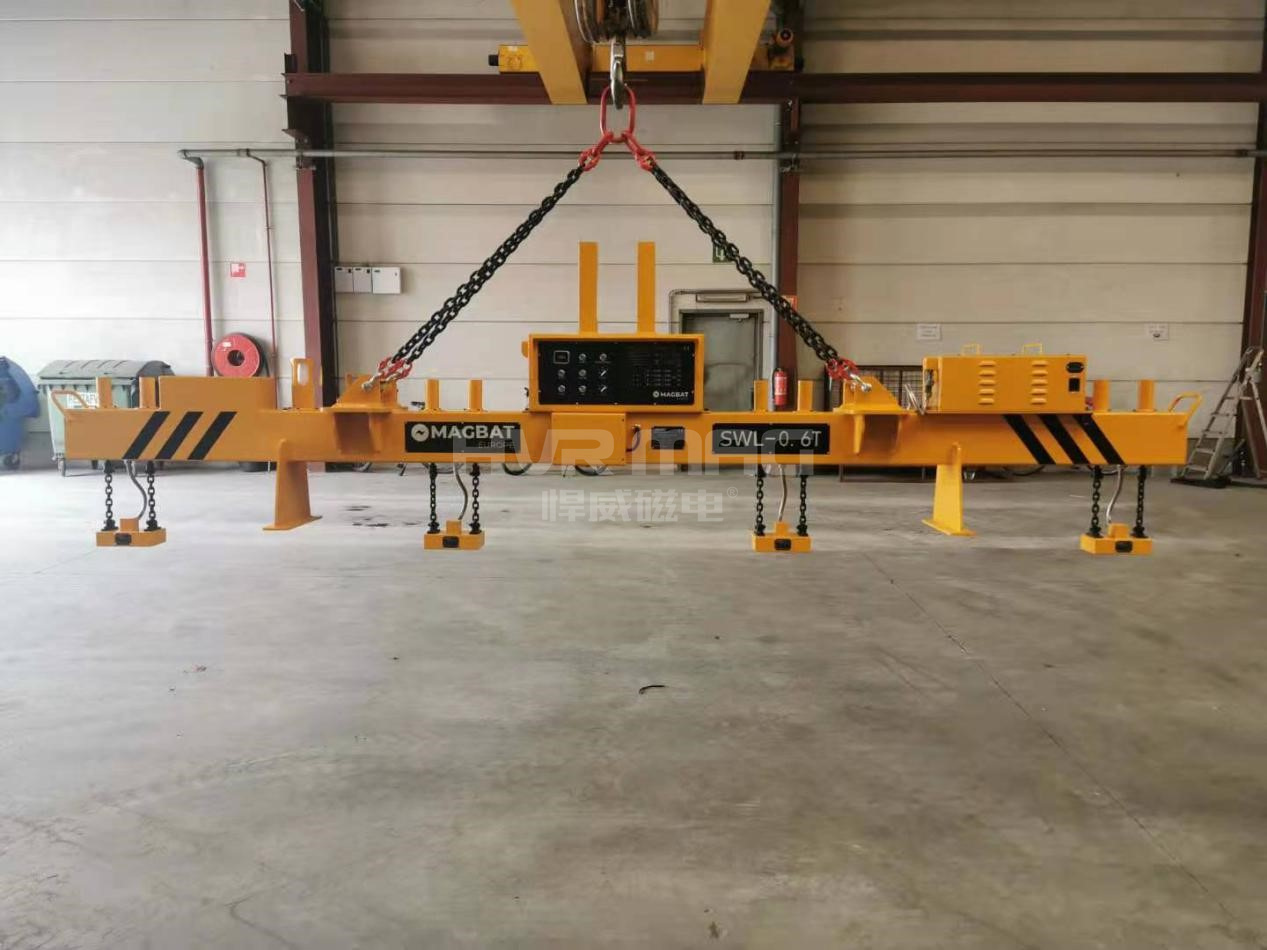通常我們出貨的鋼板磁力吊具都是長(zhǎng)磁極或者橫梁兩側(cè)對(duì)稱分布的磁鐵模塊的,用來(lái)吊運(yùn)常規(guī)尺寸寬度的板材。那窄鋼板該如何吊運(yùn)呢?別擔(dān)心,悍威也可定制如下圖這種充電式薄板磁力吊。